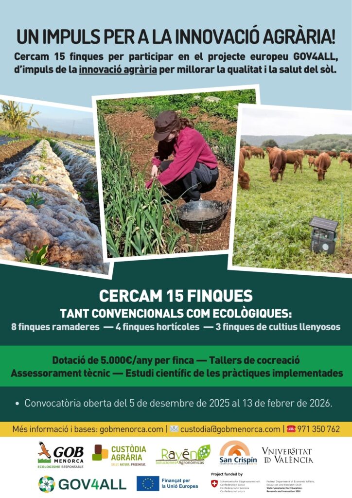This initiative, addressed to 15 farms in Menorca, both conventional and organic, will allow the selected farms to take part for two years in an innovation process that will include co-creation workshops on agricultural practices, specialised technical advice, scientific monitoring of soil health carried out by the University of Valencia, and dissemination of the results obtained. Eight livestock farms, four horticultural farms and three farms with woody crops will be selected. As compensation for the efforts devoted to the project, each participating farm will receive €5,000 per year (up to a total of €10,000 over the two years).