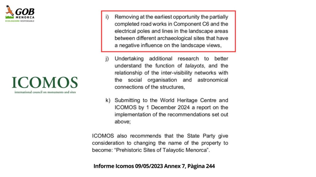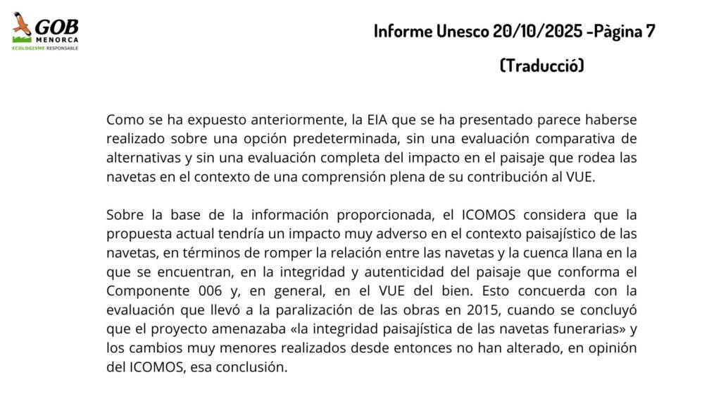In relation to the controversy over the works at Rafal Rubí, GOB wishes to recall that UNESCO has spoken very clearly about the documentation that the Island Council sent regarding the road works. There is no doubt that an opinion was issued on the information sent from Menorca.